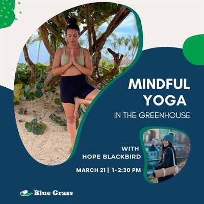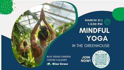 Slow down and reconnect during Mindful Yoga in the Greenhouse at Blue Grass Garden Centre, led by our local yoga instructor: Hope Blackbird. Surrounded by lush greenery, this grounding yoga experience invites you to move mindfully, breathe deeply, and find a moment of calm in a beautiful, plant-filled space.